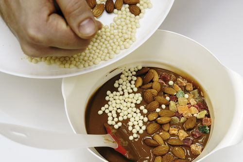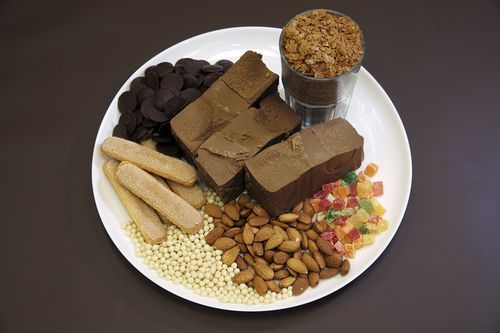 2. Ингредиенты: джандуйя (смесь шоколада с фундучной пастой), орехи-цукаты в ассортименте, различные хрустящие компоненты (мы взяли Crispearls от Callebaut - "жемчужинки" из песочного печенья в белом шоколаде и карамелизованную вафельную крошку от Cacao Barry), печенье савоярди, темный шоколад для покрытия.