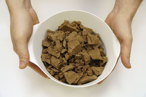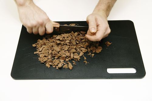 3. Так как джандуйя это, по сути, шоколад, нам нужно получить ее в темперированном виде. Для этого сначала ее измельчаем.
