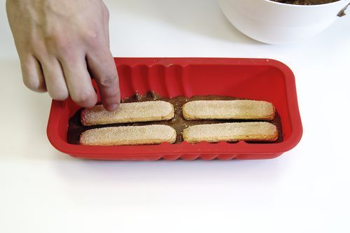 9. Половину смеси выкладываем в форму, помещаем туда же печенье савоярди, заполняем форму доверху, ставим в холодильник до полного отверждения.