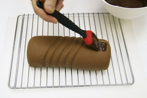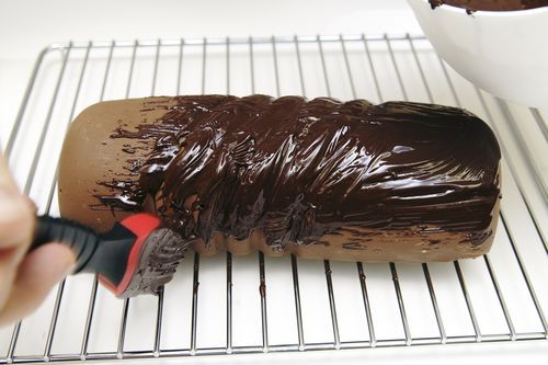 11. И с помощью силиконовой кисточки полностью покрываем полено шоколадом, изображая на его поверхности "кору дерева"