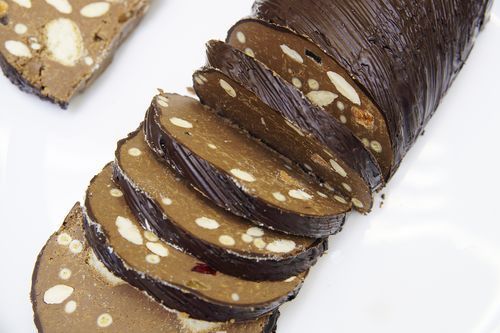 12. Даем шоколаду схватиться и разрезаем полено острым ножом на дольки 1,5-2см толщиной.