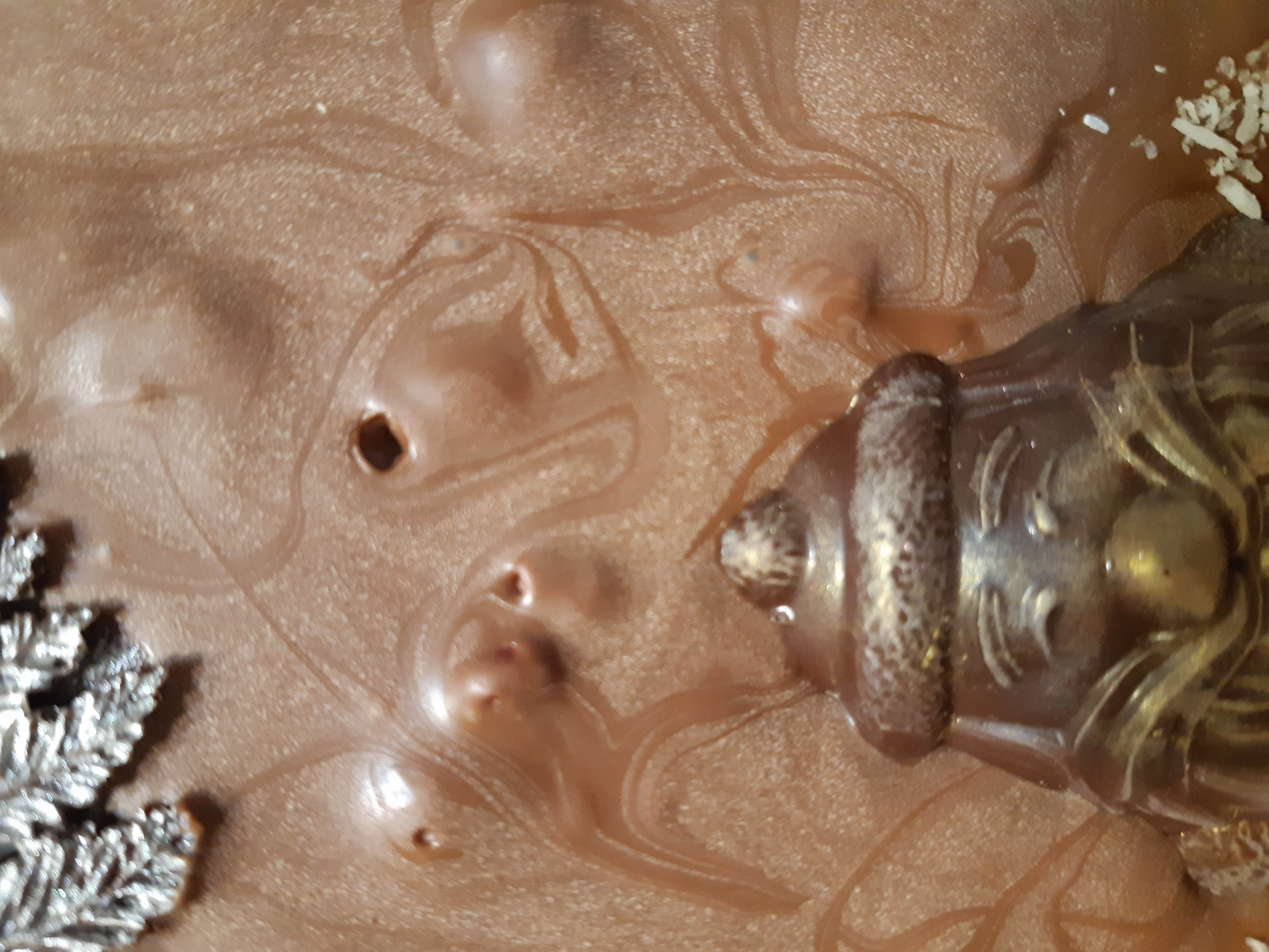 2. Проблема похожа не неправильное охлаждение. Шоколад нужно после отливки в форму БЫСТРО и АКТИВНО охладить. Форма, оставленная при комнатной температуре приведет к дефектам на изделии. Физика процесса - локальное детемперирование шоколада в результате ПЕРЕГРЕВА. который возникает во время усадки массы при охлаждении. Шоколад сжимается при остывани. И там, где отвод тепла затруднен, температура повышатеся в тонких слоях до +35 и выше, что приводит к разрушению структуры масла какао и появленияю визуальных дефектов.