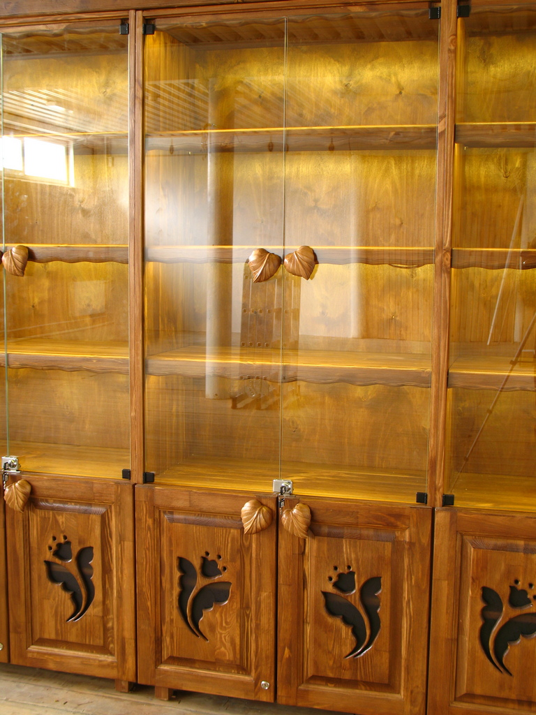 Всё сделано полностью вручную из массива дерева, с резными элементами. Каждая полка имеет подсветку. Делали под себя, потому качество самое высшее.