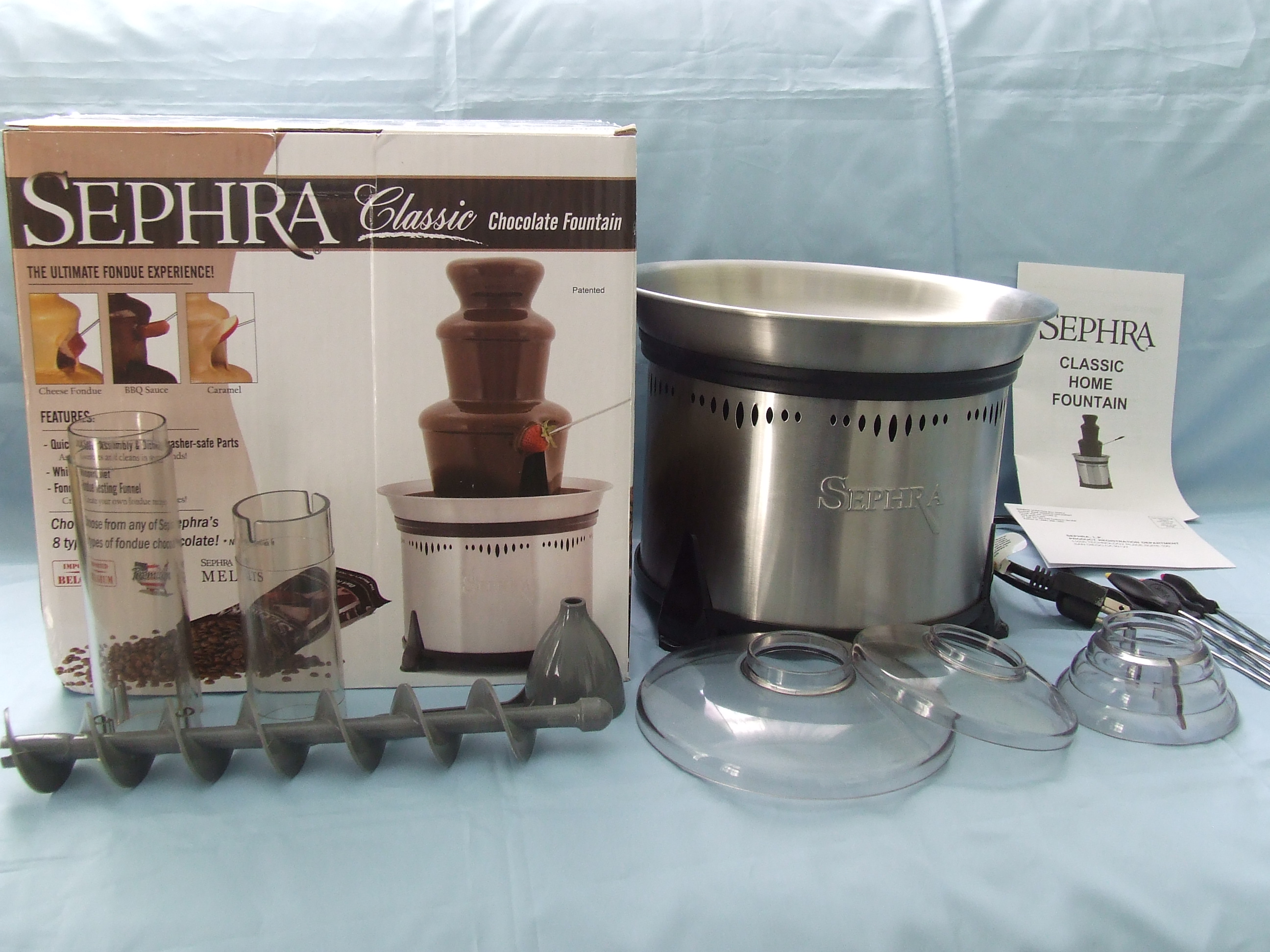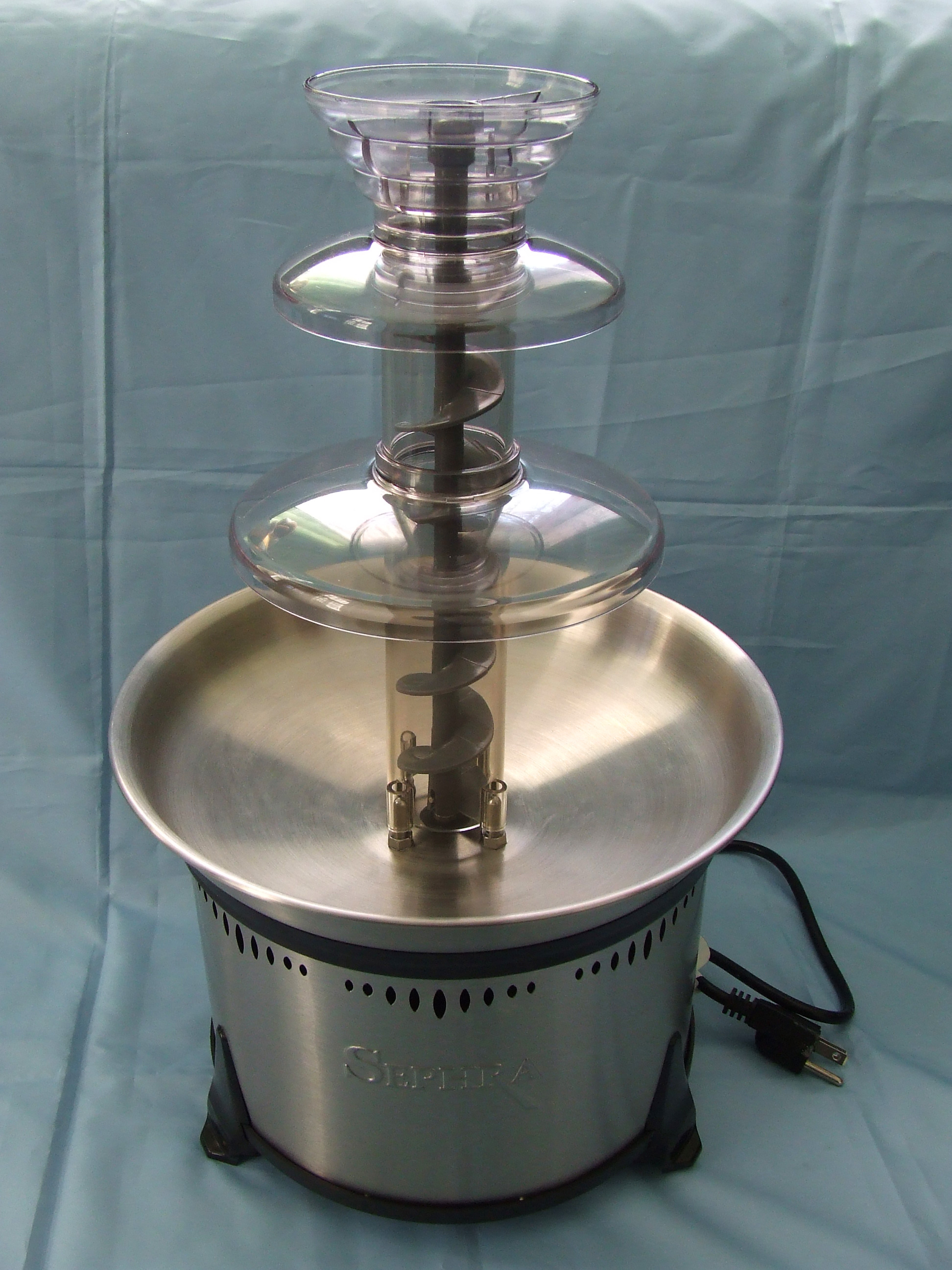 Качественный и надежный шоколадный фонтан Sephra CF-18L американского производства.Покупал на ebay.com для сдачи в оренду на празничные мероприятия, но жизнь внесла свои коррективы. Фонтан новый,в работе ни разу не был, проверил только его работоспособность.В комплекте идет понижающий трансформатор 220-110В 500Вт,сделал местный кулибин из советского медного трансформатора,так как большинство трансформаторов,которые есть в продаже ненадежные -китайские и с алюминиевой обмоткой.Фонтан расчитан на загрузку 1,5-2,5кг шоколада,высота фонтана 46см.Чаша с нержавеющей пищевой стали оснащена подогревом,что позволяет топить шоколад прямо в чаше.