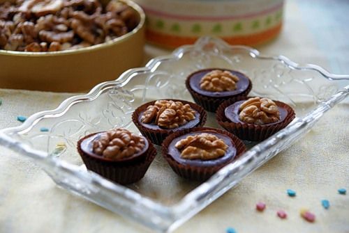 Конфеты из молочного шоколада с пралине и грецким орехом